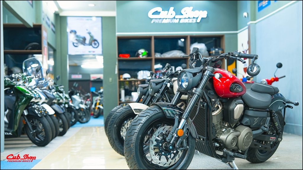 Khu trải nghiệm trưng bày xe: Giới thiệu đầy đủ các mẫu xe từ cruiser, bobber đến nakedbike, kết hợp cùng hệ thống đèn LED highlight giúp khách hàng cảm nhận rõ từng chi tiết thiết kế.